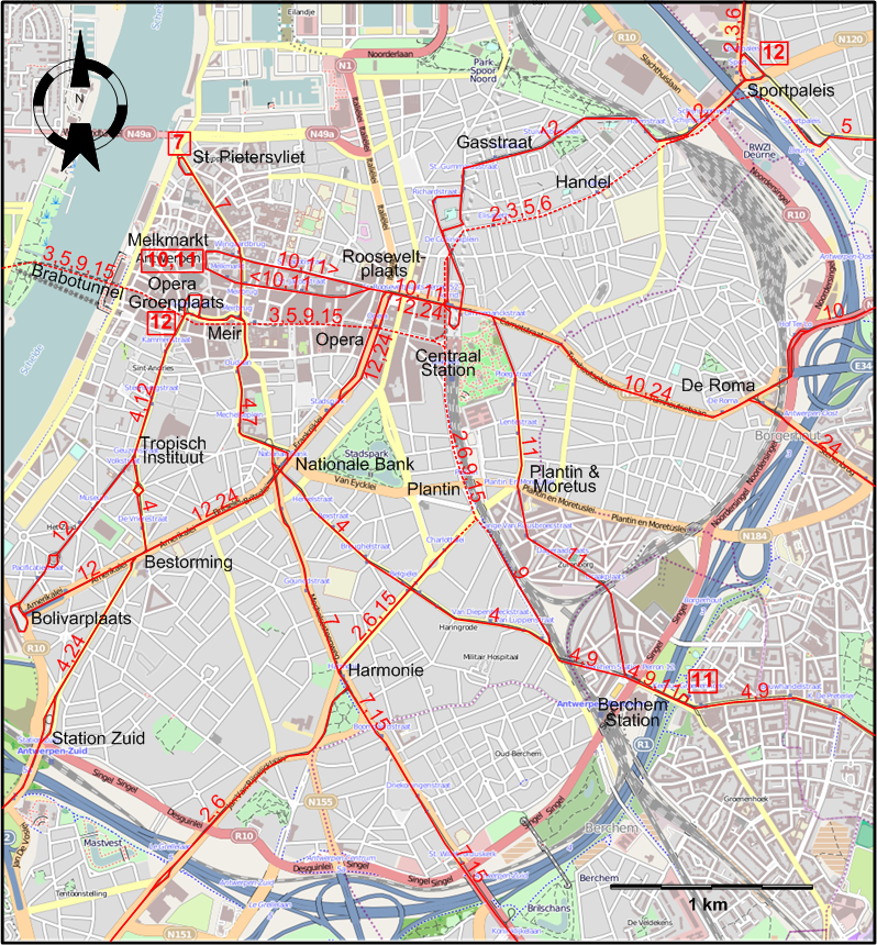 | 15 | Linkeroever – Brabotunnel – Groenplaats – Meir – Opera – Centraal Station – Plantin – Harmonie – Mortsel – Boechout |