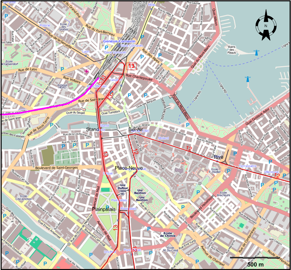 | 13 | Bachet-de-Pesay - Carouge - Augustins - rd.-pt. de Plainpalais - Stand - Cornavin (CFF Station) |