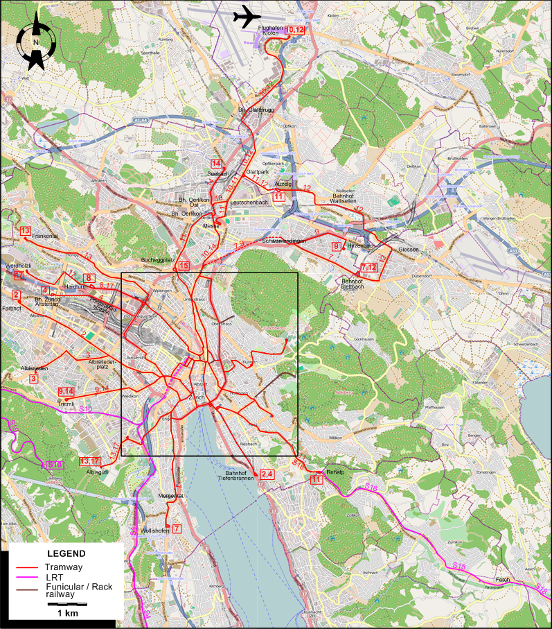 | 10 | Hauptbahnhof (Zürich Station) - Central - ETH/Universitätsspital (ETH/University Hospital) - Milchbuck - Messe - Bh. Oerlikon Ost - Leutschenbach - Glattpark - Bh. Glattbrugg - Flughafen Kloten (Zürich Airport) |