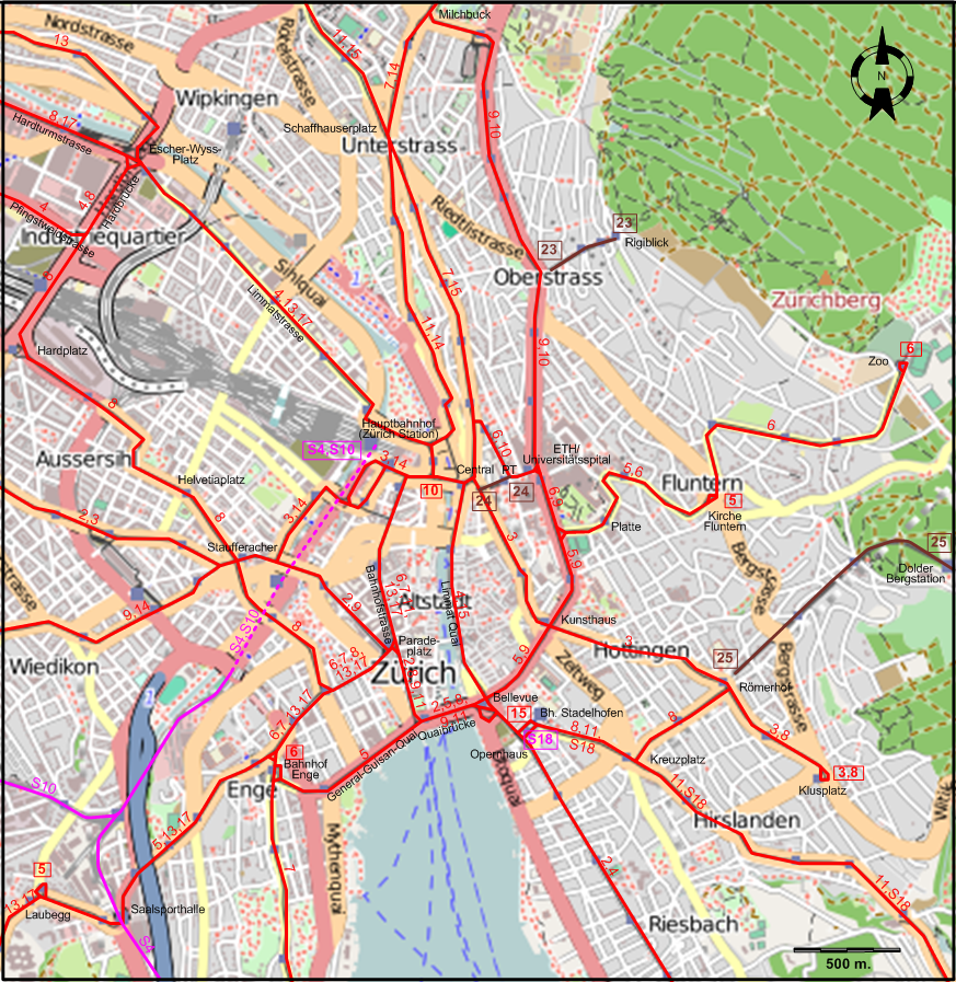 | 15 | Bucheggplatz - Schaffhauserplatz - Central - Limmat Quai - Bellevue - Bahnhof Stadelhofen |