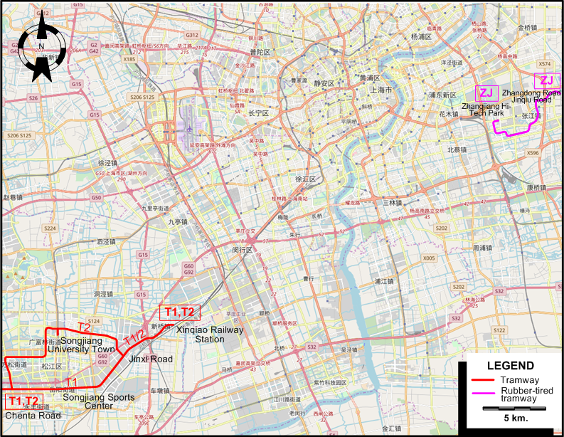 | T1 | 辰塔路 (Chenta Road) - 松江体育 (Songjiang Sports Center) - 锦昔路 (Jinxi Road) - 新桥火车站 (Xinqiao Railway Station) |
