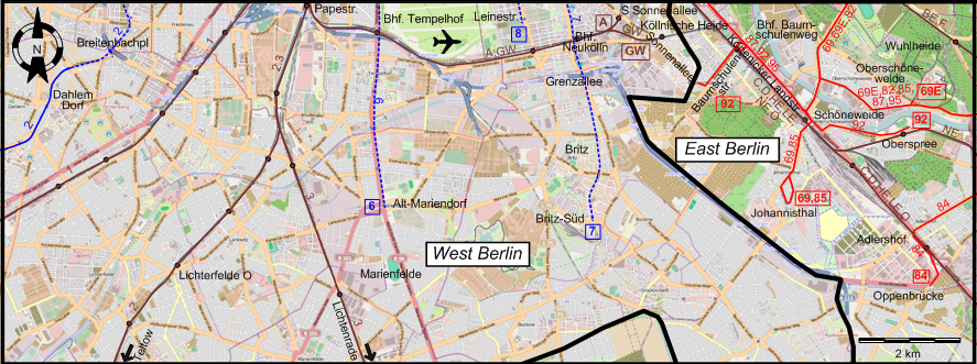 | 6 | Tegel - Leopoldplatz – Bhf. Friedrichstraße – Hallesches Tor - U Mehringdamm – U Mehringdamm – Bhf. Tempelhof - Alt-Mariendorf [Stations in East Berlin, with the exception of Bhf. Friedrichstraße, were closed to passengers] |