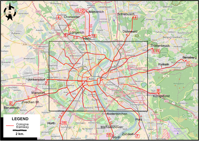 | 2 | Benzelrath - Frechen Bf. - Marsdorf - Dürener Str. - Gürtel - Aachener Str. - Rudolfplatz - Neumarkt - Heumarkt - Deutzer Brücke - Bf Deutz - Kalk - Kalk Kapelle - Ostheim |