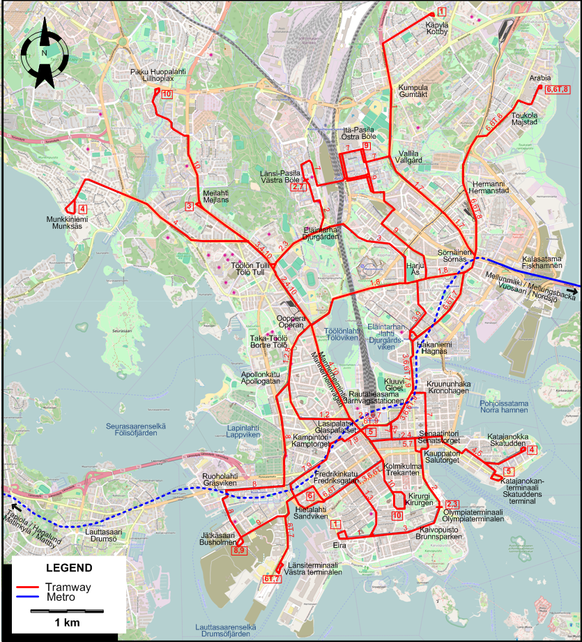 | 1 | Käpylä / Kottby − Kumpula / Gumtäkt − Vallila / Vallgård − Sörnäinen / Sörnäs − Harju / Ås - Ooppera / Operan - Taka-Töölö / Bortre Tölö - Apollonkatu / Apollogatan - Lasipalatsi / Glaspalatset − Fredrikinkatu / Fredriksgatan − Eira |