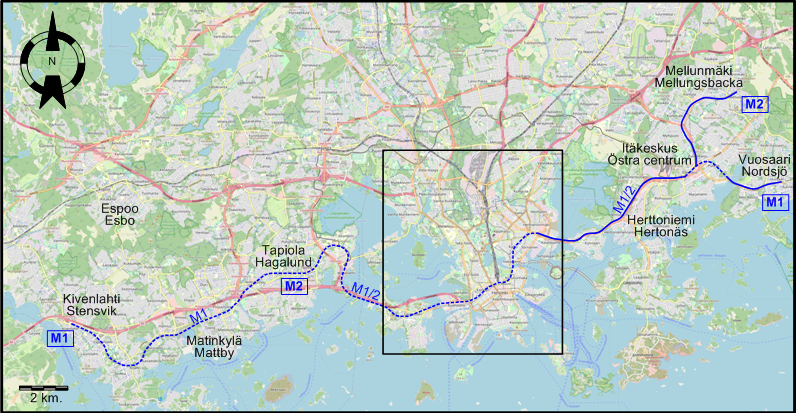 | M2 | Tapiola / Hagalund - Lauttasaari / Drumsö - Ruoholahti / Gräsviken − Kamppi / Kampen − Rautatientori / Järnvägstorget (Railway Station Square) − Hakaniemi / Hagnäs − Sörnäinen / Sörnäs − Kalasatama / Fiskhamnen − Herttoniemi / Hertonäs − Itäkeskus / Östra centrum − Mellunmäki / Mellungsbacka |