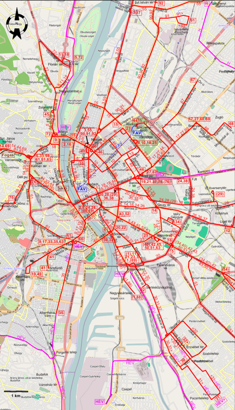 | 11 | Közvágóhíd [Slaughterhouse] - Soroksári út - Boráros tér - Lónyay u. - Kálvin tér - Múzeum körút - Madách tér - Vilmos császár út (Bajcsi Zsilinszky út) - Berlini tér (Nyugati tér) - Margit híd [Margaret Bridge] - Bécsi út - Lajos u. - Flórián tér |