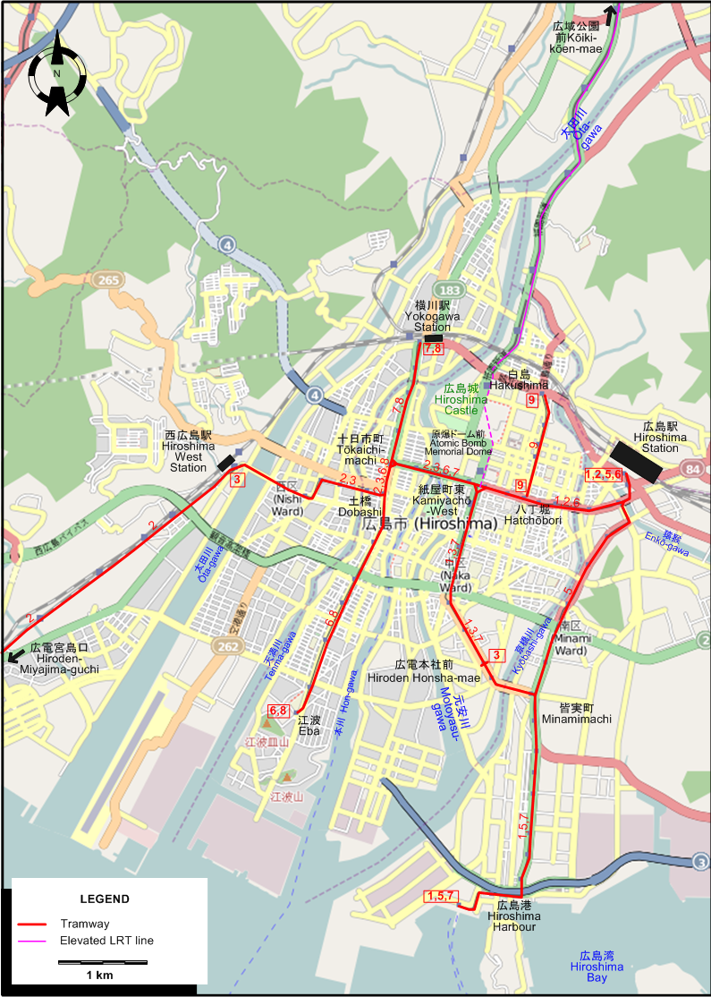 | 7 | 広島港 (Hiroshima Harbour) – 皆実町 (Minamimachi) – 広電本社前 (Hiroden Honsha-mae) - 紙屋町東 (Kamiyachō-West) – 原爆ドーム前 (Atomic Bomb Memorial Dome) – 十日市町 (Tōkaichi-machi) – 横川駅 (Yokogawa Station) |