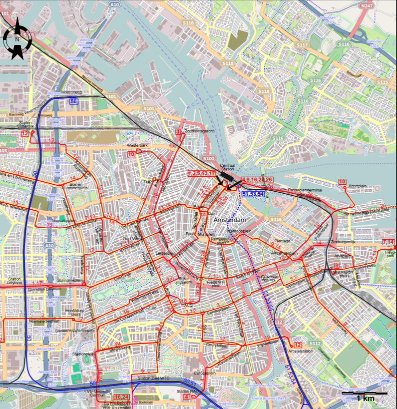 | 16 | Centraal Station – Damrak - Dam - Rokin - Muntplein - Vijzelstraat - Albert Cuypstraat - De Lairessestraat - Station Haarlemmeer - Amstelveenseweg - Stadionplein - VU Medisch Centrum - De Boelelaan / Vrije Universiteit |