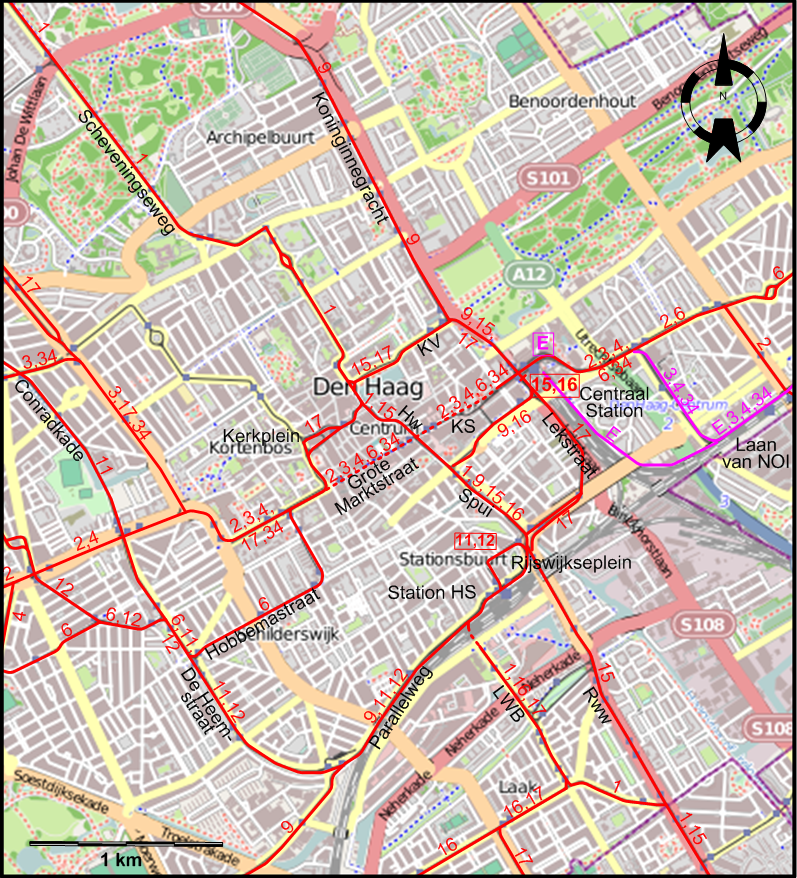 | 16 | Centraal Station – Kalvermarkt Stadhuis - Spui - Station HS – Leeghwaterbrug – Moerwijk Station – Erasmusweg – Melis Stokelaan - Wateringse Veld - Wateringen |