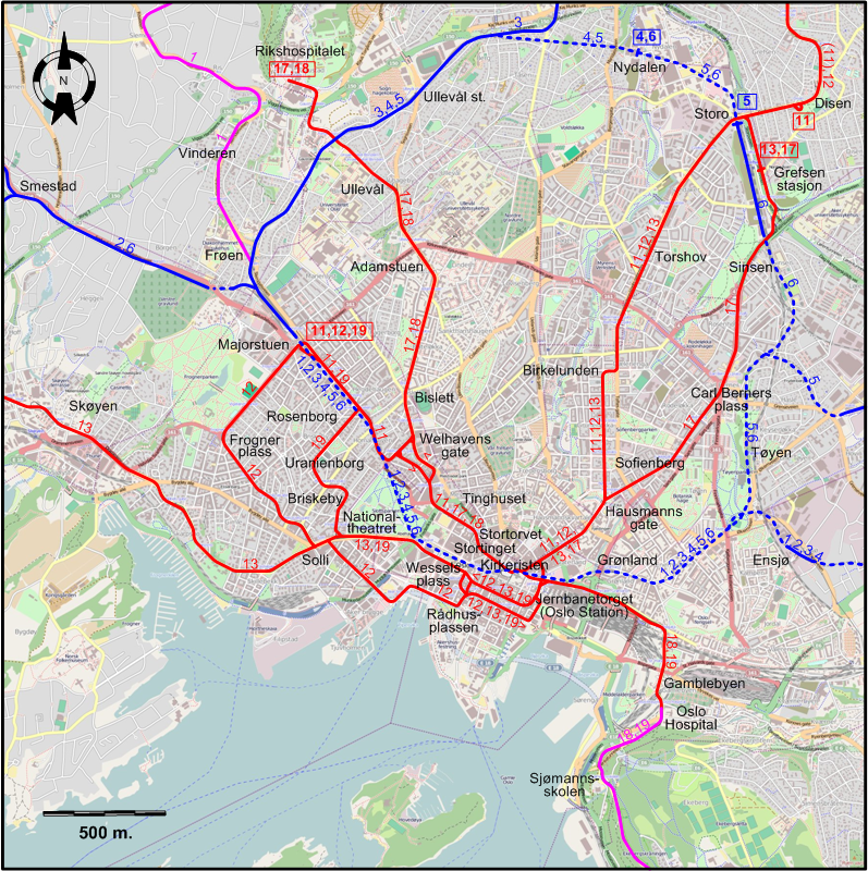 | 19 | Majorstuen – Rosenborg – Uranienborg – Briskeby – Nationaltheatret – Wessels plass – Jernbanetorget (Oslo Station) – Gamblebyen – St. Halvards plass – Oslo Hospital – Sjømannsskolen – Holtet – Kastellet – Ljabru [Between Oslo Hospital and Ljabru, operated like a Light Rail Line] |