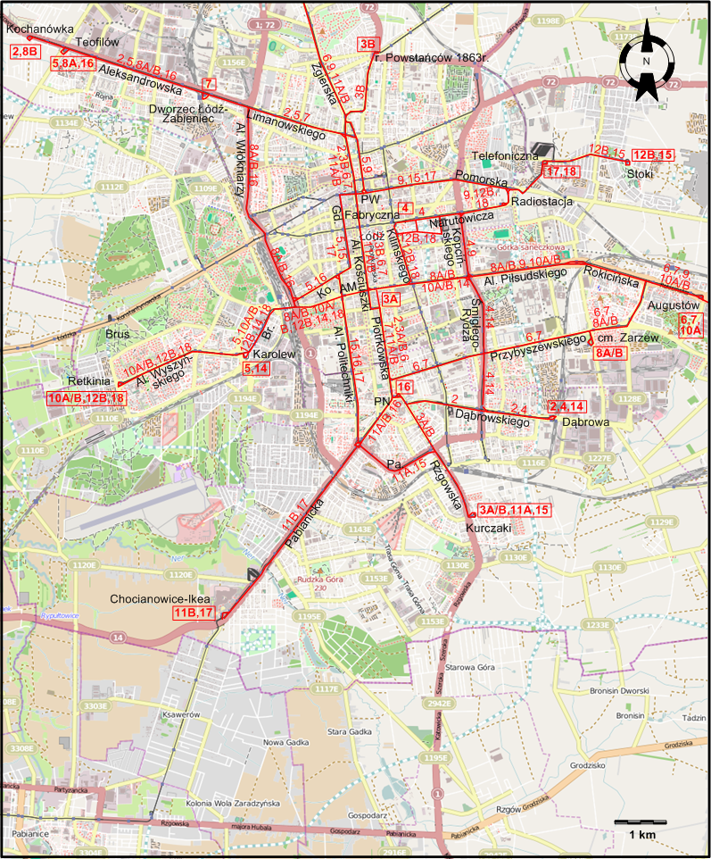 | 3B | r. Powstańców 1863r. - Al. Kościuszki - Piotrkowska – Rzgowska - Kurczaki |
