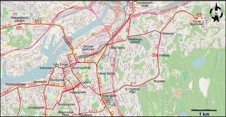 | 1 | Tynnered − Frölunda − Nymilsgatan − Marklandsgatan − Linnéplatsen − Järntorget − Stenpiren − Lilla Torget − Brunnsparken − Centralstationen − Ullevi Norra − Redbergsplatsen − Härlanda − Östra Sjukhuset |